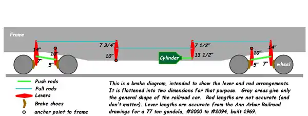 В тормозной рычажной передаче используются чугунные и композиционные тормозные колодки. Различные нажатия в соответствии с типом тормозных колодок достигаются изменением передаточного числа тормозной рычажной передачи путём перестановки валиков затяжки горизонтальных рычагов.