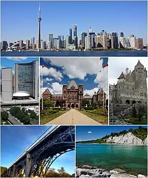 ![]() Слева направо, начиная сверху: вид на даунтаун Торонто с островов Торонто; Торонто Сити-холл; Здание парламента Онтарио; Каса Лома; Виадук Принца Эдуарда и Скарборо Блаффс | |||||