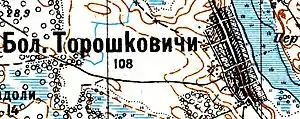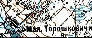 Согласно топографической карте 1926 года село называлось Большие Торошковичи и насчитывало 108 дворов, в южной части села находилась церковь. Выше по течению реки, на противоположном берегу находилось село Малые Торошковичи из 9 дворов.