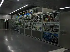 На одной из стен переходного мостика на путями установлен коллаж из фотографий, сделанных во время строительства станции.