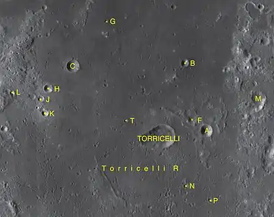 - Сателлитные кратеры Торричелли B, C относятся к числу кратеров, в которых зарегистрированы температурные аномалии во время затмений.