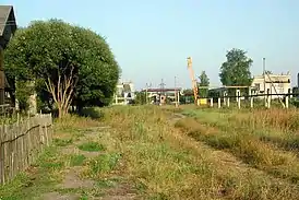 ![]() Территория бывшей станции. Слева — деревянное 2-этажное здание бывшего вокзала. Фото 2007 г. | |