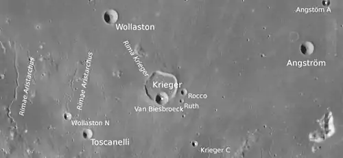 ![]() Снимок кратера с борта Аполлона-15. Кратер Тосканелли в центре снимка, левее и выше его – сателлитный кратер Волластон N. Борозды в верхней части снимка – часть системы борозд борозд Аристарха; в центре нижней части - уступ Тосканелли. | |