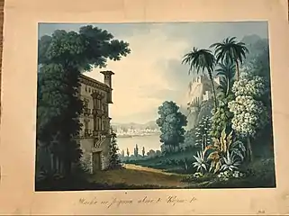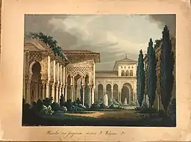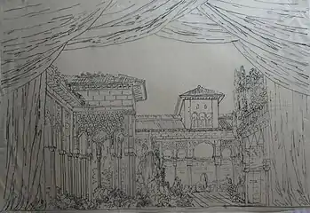 ![]() Эскиз декорации. Вторая картина второго акта. Дворец в мавританском стиле "Тоска по родине". Москва, Большой Петровский театр | |