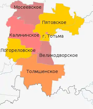Тотемский муниципальный район в рамках организации местного самоуправления включает 7 муниципальных образований нижнего уровня, в том числе 1 городское и 6 сельских поселений[22]: