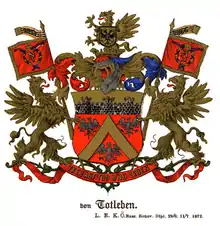 Тотлебен, Эдуард Иванович (Франц Эдуард граф фон Тотлебен; нем. Franz Eduard Graf von Totleben; 1818—1884), генерал-адъютант, инженер-генерал, жалован дипломом на потомственное дворянство; по случаю 25-летия со дня 1-й бомбардировки Севастополя возведен в графское достоинство. Был женат на Викторине, урожденной Гауф (Элизабет Викторина Луиза фон Гауф; нем. Elisabeth Viktorine Luisa von Hauff; 1833—1907), дочери купца Людвига Гауфа, великогерцогского гессенского генерального консула в Петербурге. У них был сын Николай (Николай Георг Эдуард; нем. Nikolai Georg Eduard; 1874—1945), генерал-майор[1] , на нём род графов Тотлебенов пресекся, и 12 дочерей, в том числе: