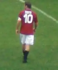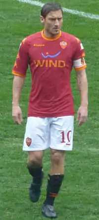 Франче́ско То́тти (итал. Francesco Totti; итальянское произношение: [franˈtʃesko ˈtɔtti][6][7]; 27 сентября 1976, Рим) — итальянский футболист, выступавший на позиции атакующего полузащитника и нападающего[8]. Бывший капитан[9] клуба «Рома», цвета которого защищал всю карьеру, с 1992 по 2017 год. Также являлся игроком национальной сборной Италии. Считается одним из лучших итальянских футболистов в истории[10]. Является послом ЮНИСЕФ. Имеет собственную статую в музее мадам Тюссо[11].