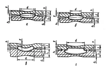 s и s1 — толщина детали; d — расчетный диаметр литого ядра точки или ширина литой зоны шва; h и h1 — величина проплавления; g и g1 — глубина вмятины