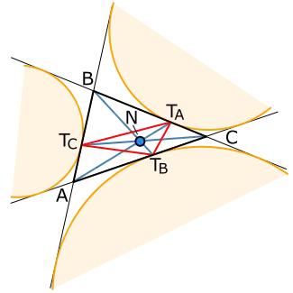 * Треугольник Нагеля (см. рис. выше) для треугольника определяется вершинами , и , которые являются точками касания вневписанных окружностей треугольника и точка противоположна стороне , и т. д.