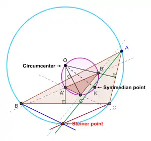 - Пусть дан любой треугольник . Пусть — его центр описанной окружности и — точка пересечения симедиан. Окружность, построенная на как на диаметре, представляет собой окружность Брокара треугольника . Прямая, проходящая через перпендикулярно к прямой , пересекает окружность Брокара в другой точке . Прямая, проходящая через перпендикулярно к прямой , пересекает окружность Брокара в другой точке . Прямая, проходящая через перпендикулярно к прямой , пересекает окружность Брокара в другой точке (треугольник есть треугольник Брокара для треугольника .) Пусть есть прямая, проходящая через параллельно прямой , есть прямая, проходящая через параллельно прямой , и есть прямая, проходящая через параллельно прямой . Тогда все три прямых , и пересекаются в одной точке. Точка их пересечения и есть точка Штейнера треугольника .