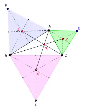 Пусть ABC — любой треугольник на плоскости. На сторонах BC, CA, AB треугольника строим внешние правильные треугольники DBC, ECA и FAB соответственно. Пусть центроиды этих треугольников — X, Y и Z соответственно. Тогда прямые AX, BY и CZ пересекаются в одной точке, и эта точка N1 является первой (или внешней) точкой Наполеона треугольника ABC.
