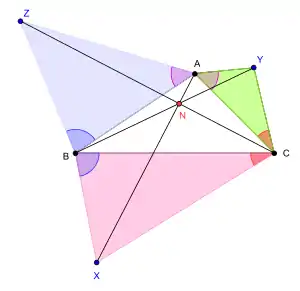 - Если треугольники XBC, YCA и ZAB построены с внешней стороны на сторонах треугольника ABC так, что