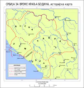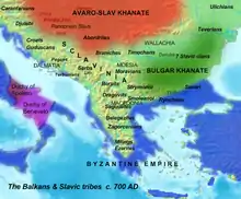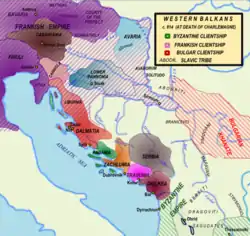 По данным византийского императора Константина Багрянородного, сербы появились на Балканах в 1-й половине VII века[5]. Они заняли территории современных Сербии, Черногории, Боснии и Хорватии[3]. После переселения на Балканский полуостров первыми территориальными объединениями у сербов, как и у большинства южных славян, были жупы. Жупы обычно занимали районы, ограниченные течением рек или горами. Их центрами являлись укреплённые поселения или города. Как административные территориальные единицы жупы в дальнейшем стали прочной основой Сербского государства[6]. Однако византийцы все эти земли назвали «склавинии». После расселения славян на Балканах в византийских источниках появляются сведения о множестве склавиний от Салоник до Константинополя, а позднее и о склавиниях, расположенных выше городов на далматинском побережье[7].