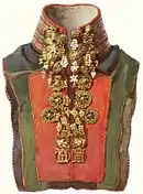Подол мог быть несколько расклёшенным. Пришивной воротник обшивался по краю цветной тесьмой, ворот застёгивался на пуговицы. Верхний проём, рукава и подол одежды украшались орнаментом в виде аппликаций в форме геометрических фигур из кусочков цветного сукна, тесьмы и бисера.