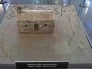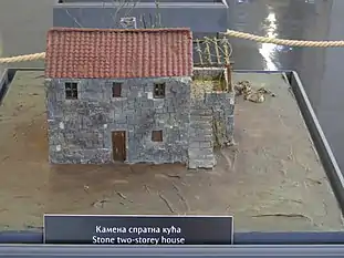 Каменные дома как из не обтёсанного, так и из тёсанного камня были распространены на побережье Адриатического моря, в горных районах Герцеговины, Черногории. Эти дома имели высоту до четырёх этажей. Каменная кладка была сухой, иногда скреплялась раствором (извести и прочего). Бедняки Черногории в начале XX века ещё жили каменных домах сухой кладки. Крыша из каменной плитки или соломы была двускатной и пологой. Крыши богатых домов покрывались черепицей[5].