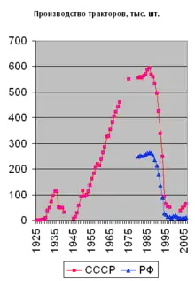 Несмотря на сохранившуюся дореволюционную производственную базу (пять заводов пригодных для изготовления тракторов) и наличие собственных разработок (тракторы «Гном», «Коломенец-1», «Карлик», «Запорожец», «Коммунар»), советская промышленность не смогла дать сельскому хозяйству ни достаточного количества тракторов, ни высокого качества выпускаемой продукции. В 1924-25 годах планировалось выпустить 1 120 тракторов, однако этот план не был выполнен. В 1925—26 годах планировалось выпустить 1 800 тракторов всех типов (с одновременной закупкой за рубежом 14 950 машин); фактически же было произведено менее 900 тракторов, большинство из которых «разваливалось на части после нескольких недель или месяцев работы»[13]. Тем не менее, таким образом были заложены основы отечественного тракторостроения и подготовлены первые кадры тракторостроителей. Дальнейшее развитие страны требовало строительства крупных специализированных тракторных заводов. Используя полученную от продажи зерна, леса, нефти и нефтепродуктов валюту, с помощью американских и европейских инженеров и поставок оборудования нескольких сотен иностранных компаний, были построены: Сталинградский тракторный завод в 1930 г. (выпускал тракторы СТЗ-15/30 (McCormick Deering 15-30 фирмы «International Harvester»)), Харьковский тракторный завод в 1931 г. (выпускал тракторы ХТЗ, подобные тракторам СТЗ), Челябинский тракторный завод в 1933 г., выпускавший гусеничные тракторы С-60 (Caterpillar Sixty). За десять предвоенных лет отечественная промышленность произвела для сельского хозяйства порядка 700 тыс. тракторов. Общий выпуск отечественных тракторов составил 40 % их мирового производства.