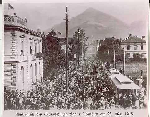 23 мая 1915 года. Батальон «вольных стрелков» Дорнбирна отправляется на I Мировую войну. Хорошо виден прицепной вагон открытого типа.