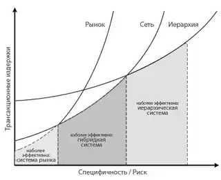 С возрастающей обоюдной зависимостью участвующих сторон в виде особых трансакционных инвестиций в качестве, например, производственных мощностей, увеличится заинтересованность в нарушении договорённостей за счёт зависимого партнёра с целью присвоения ренты. В таких условиях наиболее эффективными являются гибридные формы договора с характерными обязательствами по обмену информации и санкциями в случае невыполнения условий договора с целью избежания оппортунизма и возможных затрат на заключение дополнительных соглашений. Производство работ в рамках организации оправдано наименьшими трансакционными издержками при условиях высокого риска и больших инвестиций. Затраты на поиск информации, обсуждение и заключения договора в данном случае не возникают, а изменения и дополнения могут быть сильно упрощены. С помощью механизмов управления и контроля, свойственными организациям, возможно частичное или полное избежание вероятности оппортунизма. График «Трансакционные издержки и эффективность» показывает зависимость трансакционных издержек от специфичных инвестиций и риска. Так, к примеру, трансакции с высоким риском по мнению Уильямсона выгоднее проводить в условиях иерархических структур, в то время как менее рискованные операции могут быть эффективно проведены в рыночных условиях.