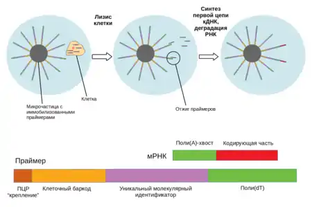 - Микрофлюидные технологии с использованием микрочастиц (англ. microdroplet-based microfluidics). Данный принцип также основан на изоляции клеток в гидрофильных микрочастицах жидкости в гидрофобной среде, но помимо клеток, в каплю попадает также твёрдая микрочастица с иммобилизированными на ней праймерами. Так же как и в предыдущем случае, в каплях содержатся изолированные клетки, лизирующий буфер и реакционная смесь для обратной транскрипции, в том числе изолированные на микрочастицах праймеры. Этот метод используется в коммерческом аппарате Chromium system from 10× Genomics. Он позволяет работать с каплями меньшего объёма, чем микрофлюидные технологии без микрочастиц, и обрабатывать от 1000 до 1000000 клеток[7].