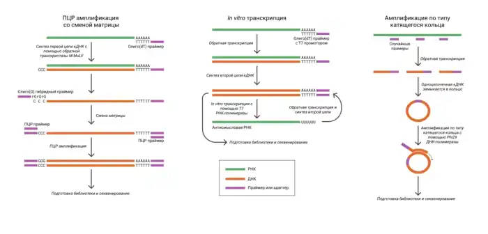 После выделения РНК необходимо получить из неё комплементарную ДНК (кДНК) с помощью обратной транскрипции[6]. Первая цепь кДНК синтезируется при помощи специально спроектированной версии обратной транскриптазы вируса лейкемии мышей M-MuLV[18]. Для инициации синтеза используются праймеры, имеющие в своей последовательности баркоды, иногда уникальные молекулярные идентификаторы и последовательности, позволяющие отобрать интересующую нас фракцию РНК. Обычно нужно избавиться от рРНК и тРНК, которые составляют до 95 % выделенной тотальной РНК клетки. Этого можно достичь, используя праймеры с поли(dT)-участком, что позволяет выделить полиаденилированную фракцию. Однако при этом теряется неполиаденилированная РНК (длинные некодирующие РНК и другие), поэтому в ряде протоколов, например, SUPeR-seq, в последовательности праймеров после поли(dT)-участка добавляется несколько (5—6) случайных нуклеотидов.