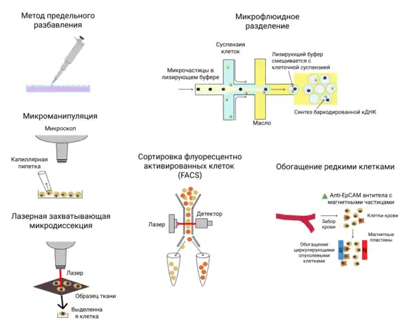Перед разделением клеток нужно прервать контакты между ними и избавиться от межклеточного вещества. Это может быть достигнуто с помощью ферментирования образца ткани, а также путём специфических манипуляций, таких как, например, лазерная захватывающая микродиссекция[6], которая позволяет выделять клетки из образца твёрдой ткани с помощью лазера. После получения клеточной суспензии клетки разделяют с помощью различных методов[7].