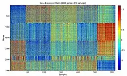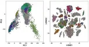 При выполнении формальных математических операций классификации, поиска корреляций принимается, что каждая клетка — это вектор в n-мерном пространстве, где n соответствует числу анализируемых генов, а координаты клетки — это уровни экспрессий соответствующих генов в ней[35]. Как уже было сказано, снижение размерности может помочь восстановить структуру данных и уменьшить шумы, и потому размерность векторов экспрессий имеет смысл понижать (при помощи метода главных компонент[36], t-SNE[37], многомерного шкалирования[38], UMAP[39] и других).