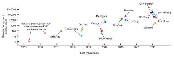 * 2015 — Технологии CytoSeq, Drop-seq, inDrop: увеличение производительности до сотен клеток за счёт использования наночастиц жидкости и иммобилизованных праймеров[9].