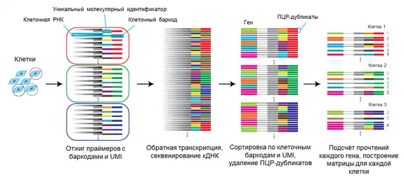 Технология высокопроизводительного секвенирования предполагает совместное секвенирование библиотек, полученных из разных клеток. Поэтому для различения транскриптов, пришедших из каждой конкретной клетки, используются уникальные клеточные баркоды[7][9] . В экспериментах по дифференциальной экспрессии помимо баркодов используются так называемые уникальные молекулярные идентификаторы (англ. unique molecular identifiers, UMIs). UMI представляет собой последовательность из 4—8 случайных нуклеотидов (например, 5 нуклеотидов дают 45=1024 уникальные последовательности). Сочетание UMI и клеточного баркода статистически получается уникальным для каждого транскрипта, что позволяет сравнивать уровни экспрессии генов по количеству UMI, «пришитых» к транскриптам определённого типа. Баркоды и уникальные молекулярные идентификаторы вносятся в образец на этапе обратной транскрипции, так как составляют часть праймера для синтеза первой цепи кДНК[7].