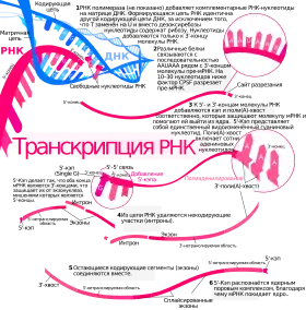 Транскрипция катализируется ферментом ДНК-зависимой РНК-полимеразой. РНК-полимераза движется по молекуле ДНК в направлении 3`- 5`[1].