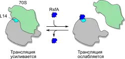 Белок RsfS (ранее известный как RsfA или YbeB) блокирует соединение двух рибосомных субъединиц. RsfS связывается с L14 — белком большой рибосомной субъединицы, блокируя связывание её с малой субъединицей и тем самым замедляя или сводя на нет трансляцию. Белки RsfS встречаются у бактерий (но не архей), а их гомологи имеются в митохондриях и хлоропластах (где они называются C7orf30 и iojap соответственно). Однако пути регуляции экспрессии и активности RsfS неизвестны[19].
