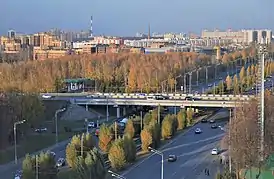 ![]() Путепровод на транспортной развязке на пересечении проспекта Победы и Оренбургского тракта (октябрь 2020) | |