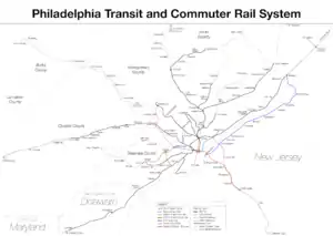 Помимо собственно линий метро, в систему также входят и обозначаются на схемах пригородная Норристаунская высокоскоростная линия, соединяющая конечную синей линии 69-я улица и город Норристаун (обозначается фиолетовым цветом) и междугородняя линия PATCO, соединяющая центр Филадельфии с Камденом и другими городами штата Нью-Джерси (обозначается красным цветом, пересадка оплачивается отдельно).