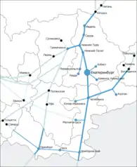 Екатеринбург — крупный железнодорожный узел. В екатеринбургском узле сходится 7 магистральный линий (на Пермь, Тюмень, Казань, Нижний Тагил, Челябинск, Курган и Тавду). Станция Екатеринбург-Сортировочный по обороту грузов является крупнейшей в стране[4]. В Екатеринбурге находится Управление Свердловской железной дороги, которая обслуживает поезда на территории Свердловской и Тюменской областей, Пермского края, Ханты-мансийского и Ямало-ненецкого автономных округов, а также части Омской области, здесь же и находится единый дорожный центр управления перевозками (ДЦУП), который отслеживает и контролирует все железнодорожные операции на территории этих регионов. Участок Пермь — Екатеринбург — Тюмень сейчас входит в основной маршрут Транссибирской железнодорожной магистрали.