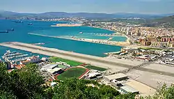 В 1939 году началась работа по строительству аэропорта Гибралтар, расположенного вблизи границы с Испанией. Уинстон Черчилль-авеню, дорога, берущая начало на границе, пересекает взлётно-посадочную полосу. Движение по дороге прекращается каждый раз, когда самолёт приземляется или взлетает. Запланированные гражданские пассажирские рейсы выполняются EasyJet, British Airways и Royal Air Maroc.