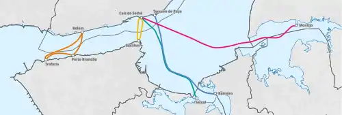- Metro Transportes do Sul (MTS) (Metro Transportes Sul do Tejo) (Metro Sul do Tejo) (Система скоростного транспорта Южного Тежу) Сейшал. Это система легкорельсового транспорта, обеспечивающая транспортное обслуживание муниципалитетов Алмада и Сейшал, Португалия. МТС соединяется с пригородными поездами Fertagus, следующими в Лиссабон и Сетубал, на станциях Pragal и Corroios. Длина 13.5 km, 3 линии, 19 станций. Колея — 1435 мм. Легкорельсовый транспорт. Открыто 30 апреля 2007 года. 750 В постоянный ток[75]. Термин «метро», используемый операционной компанией и муниципалитетом, неоднозначен. Подвижной состав представляет собой трамвай, моделью которого является Siemens Combino Plus, а сеть построена на поверхности точно так же, как трамвайная, только мост через автомагистраль A2 и его узлы находятся в полосе отвода. Чтобы считаться легкорельсовым транспортом, весь маршрут должен быть исключительно полосой отвода[76].