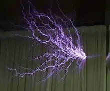 - Дуговой разряд — образуется во многих случаях. Например, при достаточной мощности трансформатора, если к его терминалу близко поднести заземлённый предмет, между ним и терминалом может загореться дуга (иногда нужно непосредственно прикоснуться предметом к терминалу и потом растянуть дугу, отводя предмет на большее расстояние). Особенно это свойственно ламповым катушкам Теслы. Если катушка недостаточно мощна и надёжна, то спровоцированный дуговой разряд может повредить её компоненты.