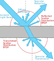 Отражающие способности поверхностей — количество отраженного света, его направление и цвет, — моделируются с использованием двулучевой функции отражательной способности. Эквивалентом перенесённого света (света, прошедшего через объект) является функция двунаправленного поверхностного рассеивания отражения (англ. Bidirectional scattering distribution function). Трассировщик пути может воспользоваться всеми преимуществами сложных, тщательно смоделированных или вычисленных функций распределения, которые определяют внешний вид («материал», «текстура» и «затенённость» в терминах компьютерной графики) объекта.