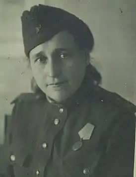 В первые дни войны добровольцем ушла на фронт. Капитан медицинской службы, 55-я армия (55 А). Награждения: медаль "За оборону Ленинграда", орден "Красной Звезды", орден Отечественной войны 1 степени, медаль "За Победу над Германией", медаль "За победу над Японией".[1]