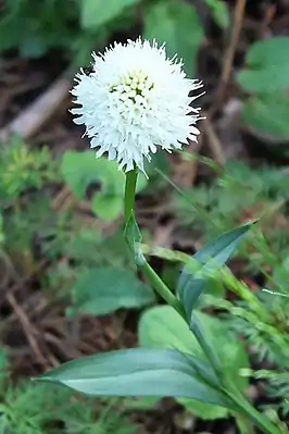 Соцветие коротко-цилиндрическое, почти головчатое, (1,5) 2—4,5 (5) см длиной, 1,7—3,2 см в диаметре. Прицветники узколанцетные, клиновидные, равные завязи или немного короче её, зеленые. Цветки белые (у сухих экземпляров бледно-желтоватые), лопасти губы к верхушке с пурпурными крапинками. Листочки наружного круга околоцветника (5) 6—7 (8) мм длиной, 1,2—1,6 мм шириной, на верхушке с лопатчатым расширением 0,9—1,2 мм шириной, часто с 3 жилками. Листочки внутреннего круга околоцветника при основании более или менее неравнобокие, заостренные, на верхушке также лопатчато расширенные, с 3—5 жилками, (4.5) 5—6 (7) мм длиной, (1,5) 2—2,5 (3,5) мм шириной. Губа 6—7 мм длиной, (4) 4,5—6 (7) мм шириной. Боковые доли губы ромбические, иногда по краю неясно зубчатые, (0,9) 1,2—2 (2,2) мм длиной. Средняя доля продолговатая, (1,8) 2,2—3 (3,7) мм длиной, на верхушке клиновидно оттянутая в лопасть 1—1.25 мм длиной. Шпорец 3—5 мм длиной, 0,6—0,7 мм шириной.