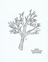 Трахеи являются тонкими разветвленными трубочками эктодермального происхождения. В эмбриогенезе животных они возникают как глубокие впячивания покровов. Стенки трахей состоят из однослойного эпителия и выстланы кутикулой. Последняя состоит из толстой хитиново-белковой прокутикулы и тонкого кутикулинового слоя эпикутикулы. У насекомых прокутикула образует спиральные утолщения (тенидии), которые препятствуют слипанию стенок трахей. Наружу трубочки открываются парными отверстиями — дыхальцами или стигмами. Каждое дыхальце насекомых обслуживает три поперечные трахеи, соединенные между собой тремя парами продольных трахей. От этих основных стволов отходят разветвления к тканям и органам. Они заканчиваются тонкими трубочками диаметром 1—2 мкм — трахеолами. Концы трахеол или лежат на поверхности отдельных клеток, или входят внутрь их.