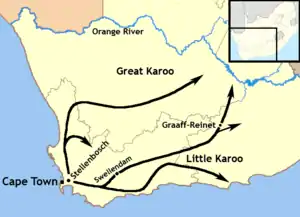 Когда в 1652 г. первые белые поселенцы высадились на мысу Доброй Надежды, основная цель поселения состояла в создании торговой фактории Нидерландской Ост-Индской компании. Капская колония постепенно расширялась. При этом возникли такие поселения, как Стелленбос и Франсхук. Тем не менее, Ост-Индская компания сохраняла жёсткий контроль над территорией, ограничивая свободы буров.
