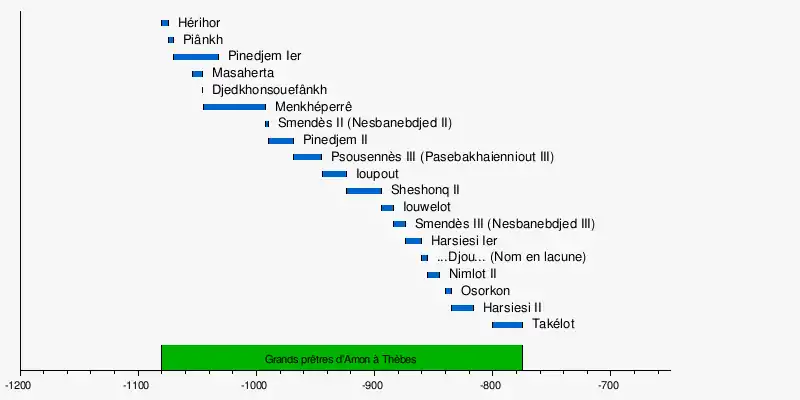 - 1069 до н. э. Верховный жрец Амона Херихор после смерти последнего представителя XX династии и Нового царства Рамсеса XI (1099—1069 до н. э.) делает своего сына Смендеса фараоном в Танисе (XXI династия), а Верхним Египтом правят фиванские жрецы Амона-Ра.