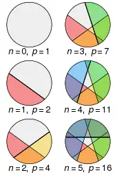 Максимальное количество кусков, которое можно получить с помощью прямых разрезов пиццы (см. рисунок справа), равно (см. Центральные многоугольные числа, последовательность A000124 в OEIS).