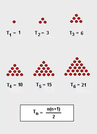 Треугольное число — один из классов фигурных многоугольных чисел, определяемый как число точек, которые могут быть расставлены в форме правильного треугольника. Как видно из рисунка, -е треугольное число — это сумма первых натуральных чисел: