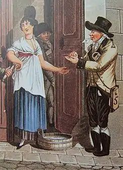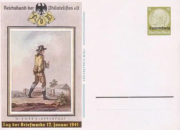 ![]() Почтовая карточка Третьего рейха (Mi #P 4), выпущенная ко Дню почтовой марки, 12 января 1941 года, с репродукцией гравюры Иеронима Бенедикта «Письмоносец с трещоткой» (конец XVIII века) и надпечаткой немецкой оккупации Люксембурга на стандартной марке |
