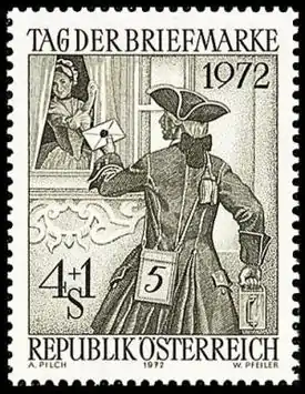 Малая почта Вены стала также сюжетом австрийской почтово-благотворительной марки, вышедшей 1 декабря 1972 года (Sc #B328). Поводом для выпуска снова послужил День почтовой марки. дизайн был подготовлен художником Адальбертом Пильхом (Adalbert Pilch); гравёр — Вернер Пфайлер (Werner Pfeiler). На миниатюре запечатлён почтальон с трещоткой, вручающий письмо горожанке[20].