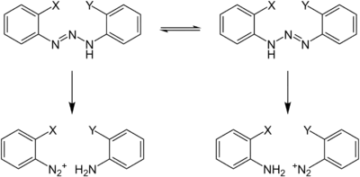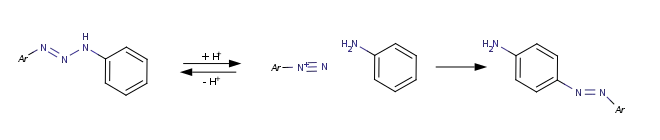 В кислой среде триазены протонируются с образованием неустойчивых ионов диазоаммония, способных разлагаться на исходные амин и диазониевую соль, в случае 1,3-дизамещенных триазенов вследствие таутомеризации может образовываться смесь диазониевых солей и аминов: