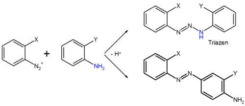 Побочным процессом при разложении триазенов, несущих ароматические заместители со свободными орто- и пара-положениями под действием кислот является азосочетание образовавшихся диазониевой соли и ароматического амина с образованием ариламиноазосоединений: