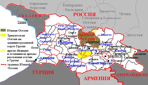 - «Районы Триалетской Осетии» здесь включают все 4 района края Шида-Картли (Горийский, Хашурский, Карельский, Каспский), 2 района края Квемо-Картли (Цалкский, Тетрицкаройский), 1 район края Самцхе-Джавахети (Боржомский район).