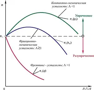 Эффект Λ-взаимодействий повреждений (функция Λσ\τ) обусловлен нормальными напряжениями (индекс σ) от внеконтактных объемных нагрузок (усталость) и фрикционными напряжениями (индекс τw) (трение и износ). Согласно этому эффекту, повреждения от различных (контактных и объемных) нагрузок не суммируются, а диалектически взаимодействуют[1][2][3].